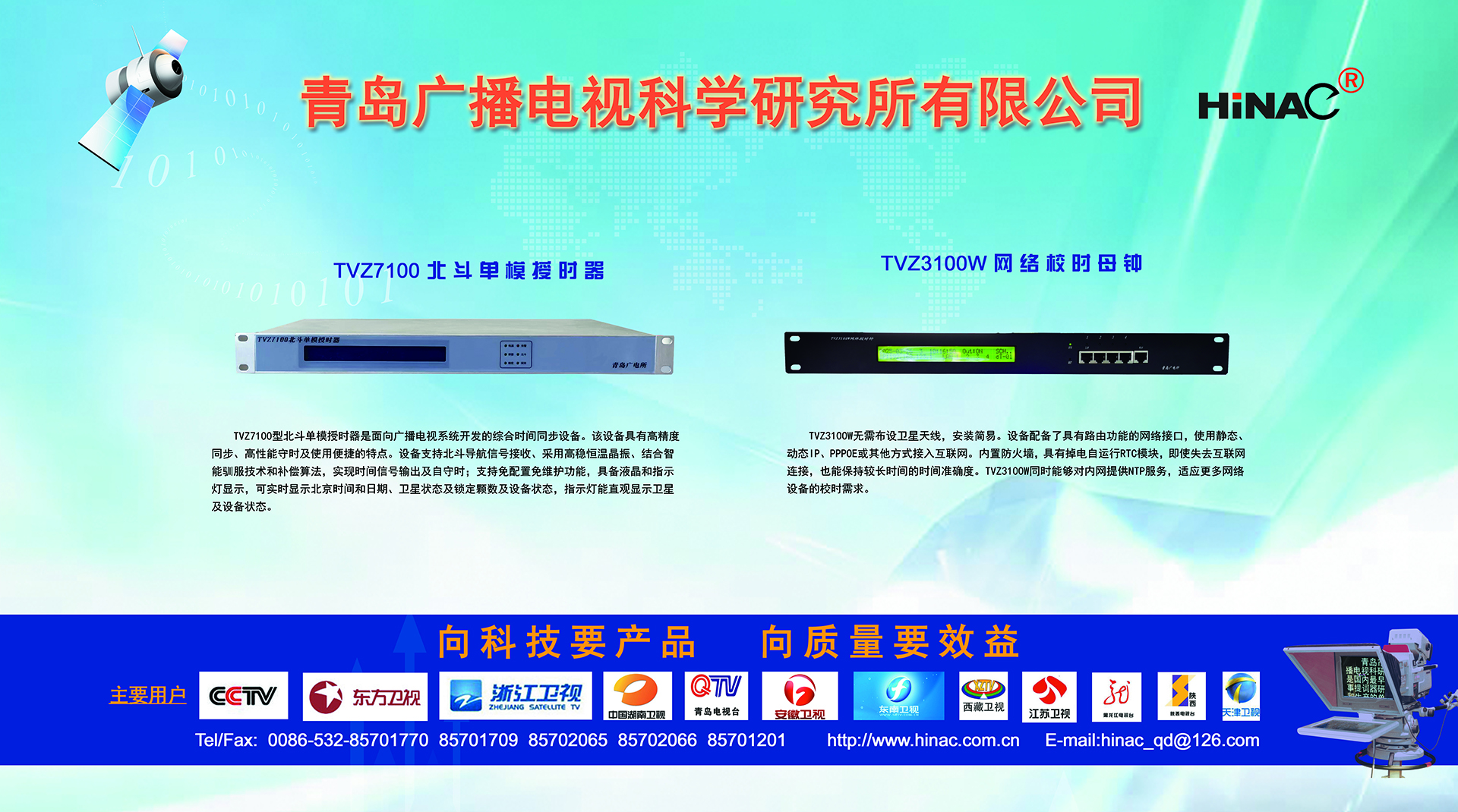 25年不悔的執(zhí)著追求! 25年不懈的專業(yè)堅持! 青島廣播電視科學(xué)研究所有限公司(簡稱青島廣電所)以其對廣電科技事業(yè)無限的熱愛,以及為爭做中國最優(yōu)秀廣電產(chǎn)品供應(yīng)商的美好理想,25年如一日,深耕廣電設(shè)備這塊沃土,已經(jīng)形成且被市場高度認可的成果有: TVZ系列GPS/北斗自動校時鐘系統(tǒng) TC系列電視播音提詞器及電視直播系統(tǒng)整體解決方案 TL系列泰麗訊源指示系統(tǒng) QD系列搶答表決評分系統(tǒng) IC系列廣電一卡通管理系統(tǒng) 同時向:廣電設(shè)備集成商、地鐵輕軌信號系統(tǒng)設(shè)備供應(yīng)商及其它業(yè)務(wù)方向創(chuàng)新、拓展、前行! 青島廣電所在國家廣電傳媒事業(yè)不斷發(fā)展的今天,愿意和您攜手并進,為我們共同的事業(yè)發(fā)展添磚加瓦開拓創(chuàng)新。愿意和您一道,把工作中的一個奇思妙想轉(zhuǎn)變?yōu)橐豁梻?..